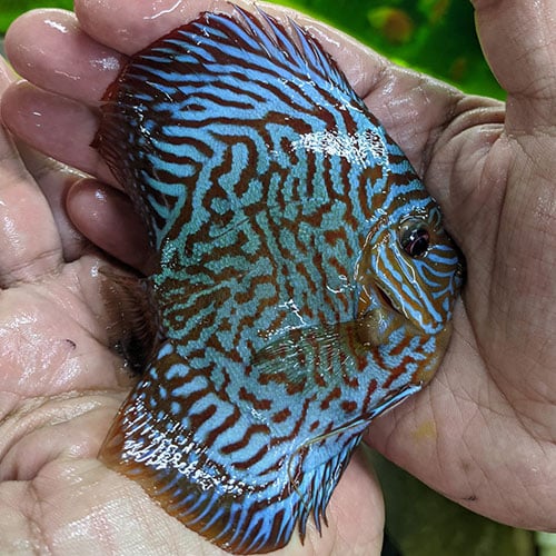 Ontdek onze prachtige Tijger Turquoise Discus High Body. Deze unieke discusvis onderscheidt zich door zijn opvallende tijger turquoise kleur en hoge lichaamsbouw. Een echte aanwinst voor elke aquariumliefhebber.